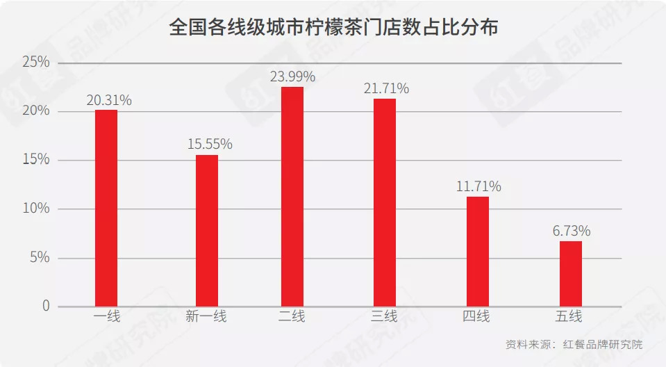 红餐品牌研究院数据表明,全国柠檬茶门店数在一线城市的占比(20.31%)要比二三线城市要低(二线:23.99%;三线:21.71%)。侧面反映出柠檬茶品类下沉属性较强,除了在广深等核心商圈快速扩张的潜力品牌之外,在湛江、长沙等区域分布的茶饮门店也不少。