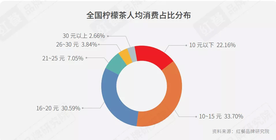 同时,红餐品牌研究院统计的数据显示,86.45%以上的柠檬茶品牌人均消费集中在20元以下,其中人均消费在10元以下的占22.16%,10~15元占比 33.70%,16~20元占比30.59%。
