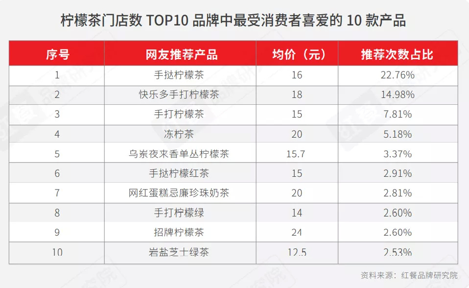 红餐品牌研究院选取了柠檬茶门店数排名前10的品牌,对他们的产品进行了分析后发现,最受欢迎的10款消费者推荐产品如下图所示: