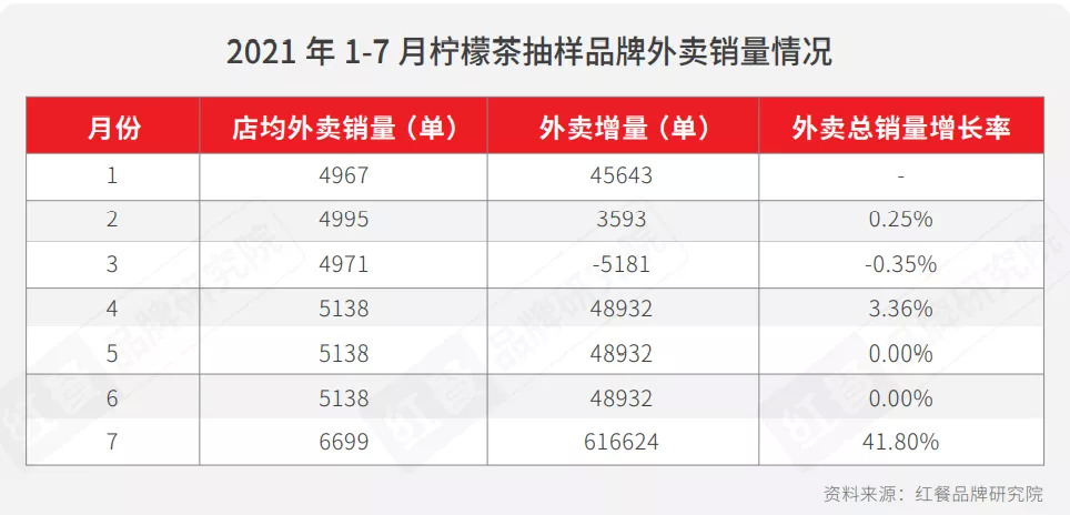 红餐品牌研究院的数据表明,2021年柠檬茶抽样品牌1-7月份的外卖销量随着气温的升高而有了比较明显的上升。