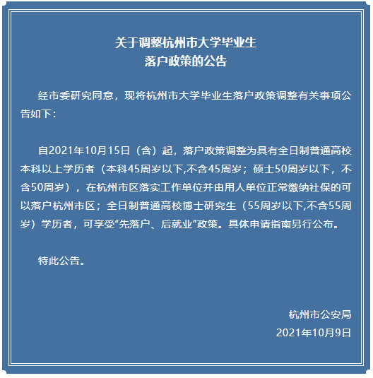 杭州市公安局10月9日在其微信公众号上发布公告称,经市委研究同意,现将杭州市大学毕业生落户政策调整有关事项公告如下: