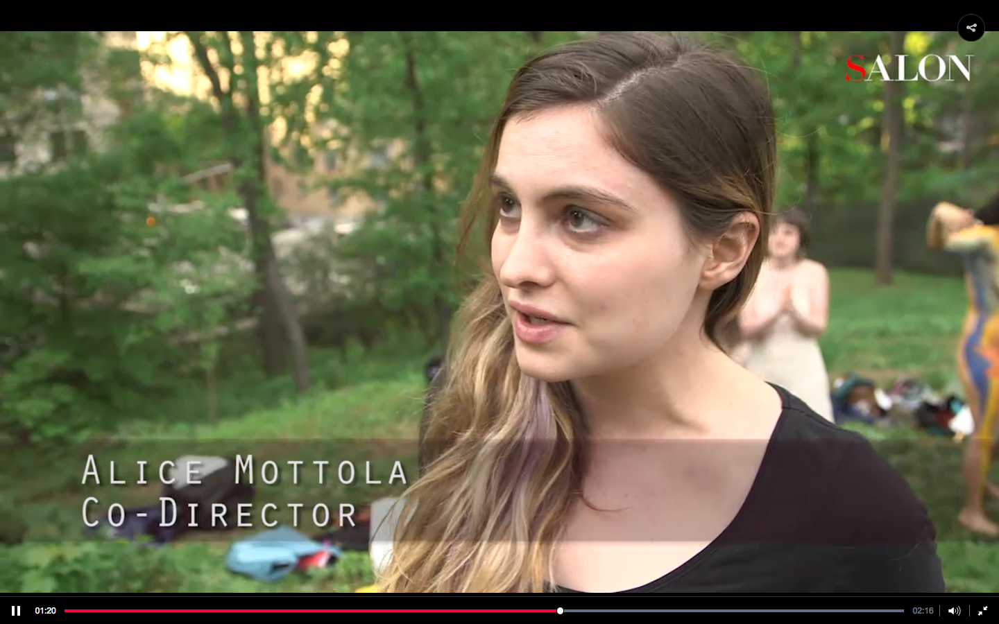 这出话剧的导演是Alice Mottola和Pitr Strait,都来自一个组织:Outdoor Co-Ed Topless Pulp Fiction Appreciation Society(“女生户外低俗小说品鉴协会”),专门组织户外裸体读书活动,目的是为了让女性裸体不再被妖魔化。他们的口号很清奇:“Burn Bras, Not Books. ”——“烧Bra!书留下!”