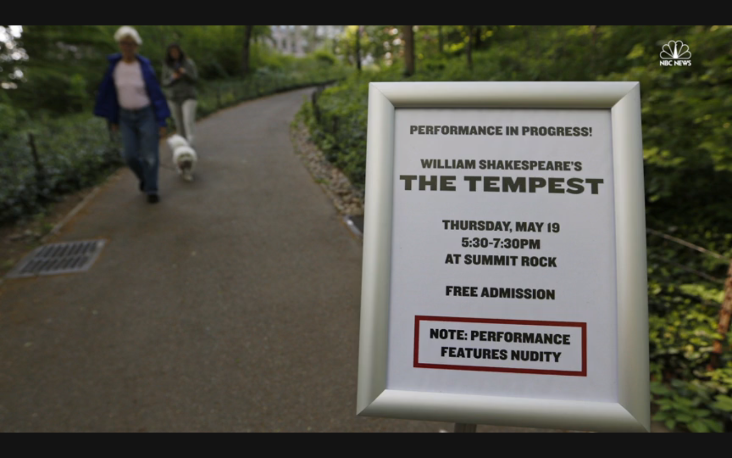 纽约州的法律原则上禁止公共场合全裸,但如果是为了艺术,比方说戏剧,是可以破例的。Mottola和她的团队拿到了公园的演出许可证。演出当天,入口处专门竖着牌子警告演出会有裸体,防止一些吃瓜群众误入受到惊吓。▼