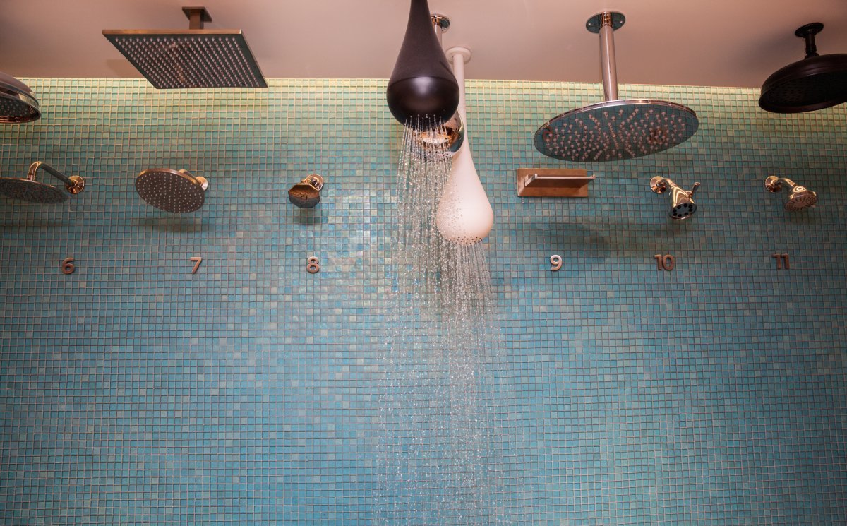 Pirch里还有一个很特别的浴室,这里有几十个不同的淋浴喷头,这些都可以在iPad上控制。你可以同时选择体验多个喷头同时对你冲的感觉。
