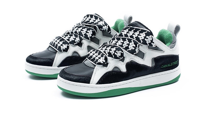 配色采用CANALSTREET经典的黑绿撞色,材质为皮质材料与马毛混搭,整体呈现复古街头运动感。