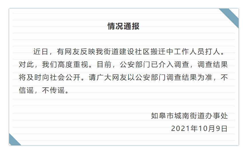 据“如皋高新区发布”微信公众号消息,近日,有网友反映如皋市城南街道建设社区搬迁中工作人员打人。对此, 如皋市城南街道办事处高度重视。目前,公安部门已介入调查,调查结果将及时向社会公开。请广大网友以公安部门调查结果为准,不信谣,不传谣。