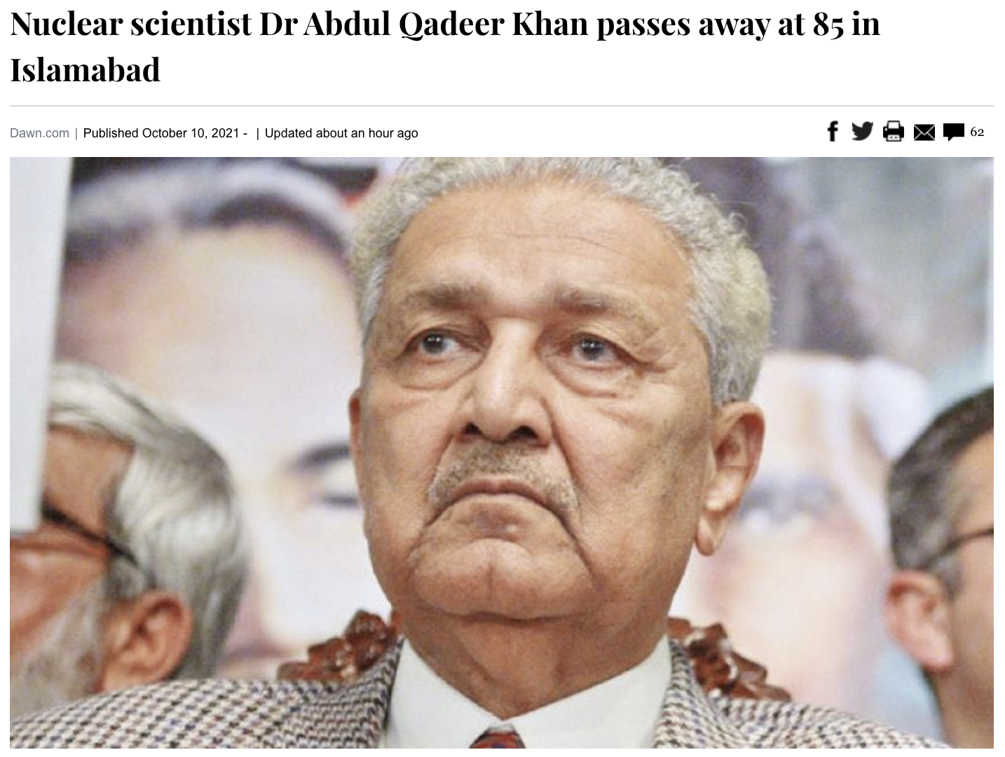 据法新社10月10日援引巴基斯坦电视台(PTV)消息报道,巴基斯坦“核弹之父”阿卜杜勒·卡迪尔·汗(Abdul Qadeer Khan)去世,终年85岁。