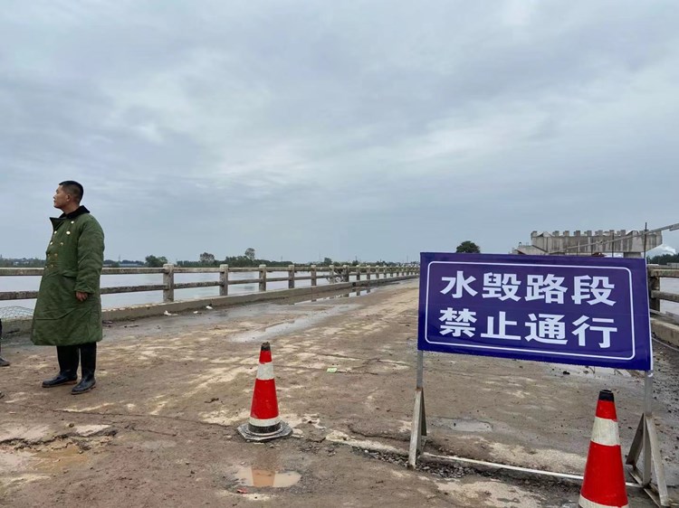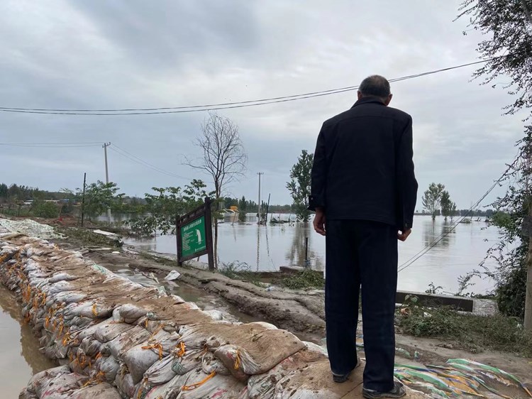 桥东村一位村民上堤查看水情。