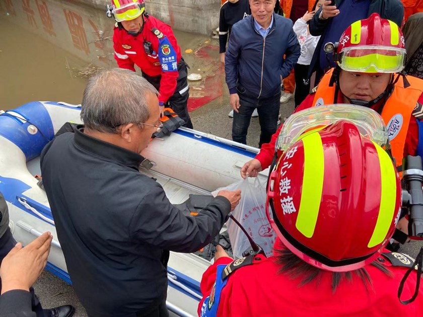 河南省焦作市温县安心救援队帮助居民运送物资。