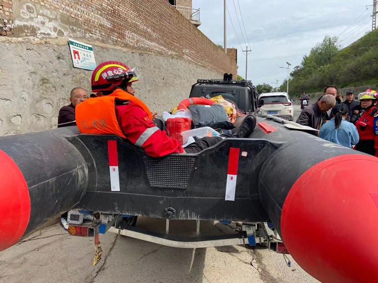 一位救援队员在冲锋舟上休息。