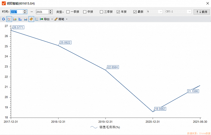 虽然近几年明阳智能经历了陆上风电与海上风电的抢装,但毛利率自2017年起便明显下滑,不过今年上半年有所回升。