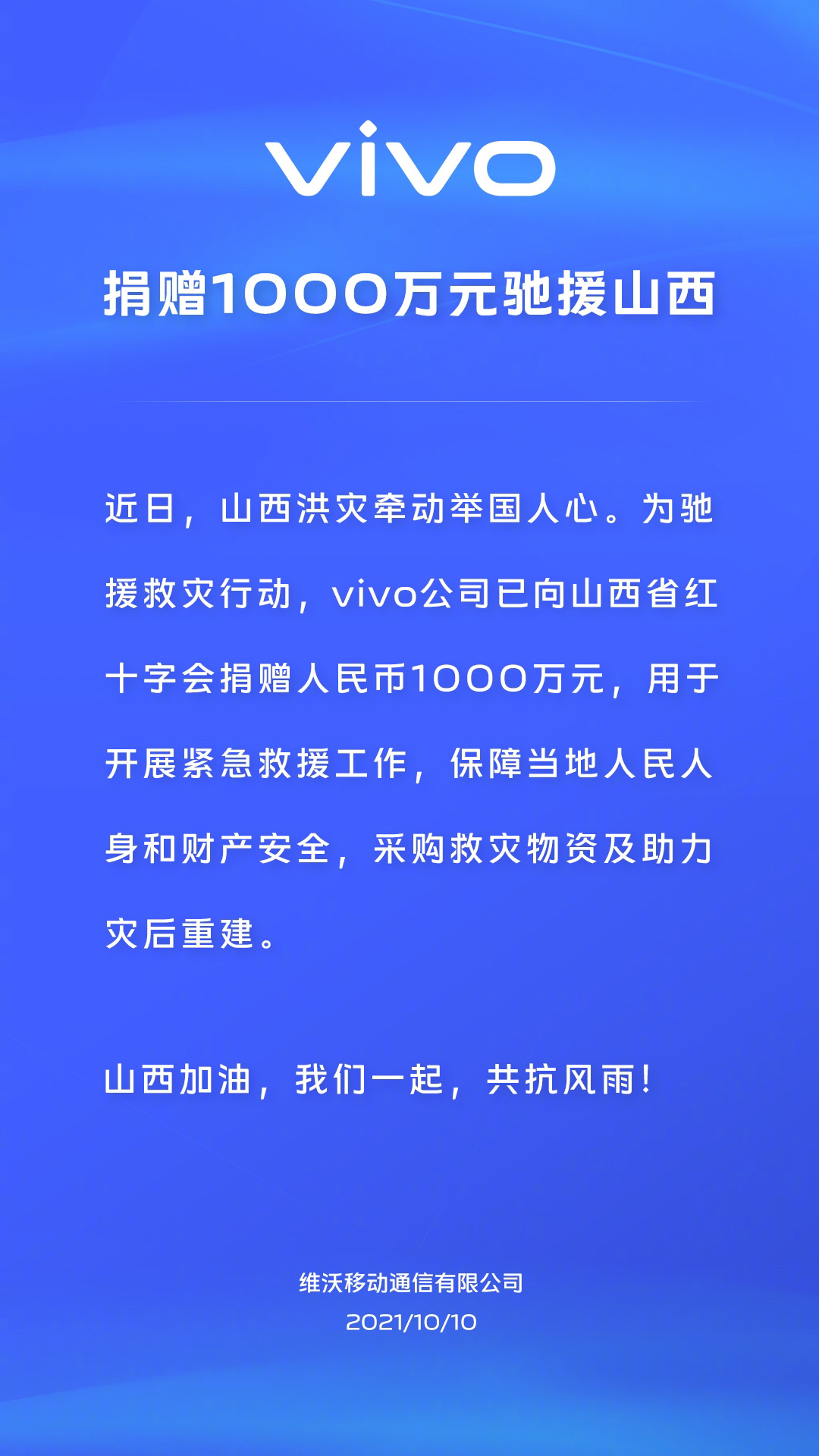 10月10日,@vivo 宣布,公司已向山西省红十字会捐赠人民币1000万元,用于开展紧急救援工作,保障当地人民人身和财产安全,采购救灾物资及助力灾后重建。