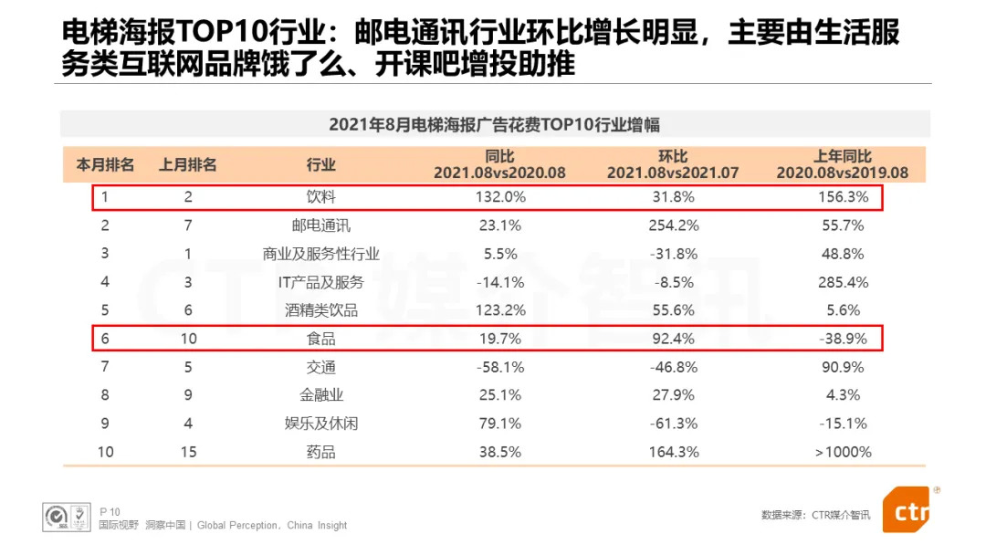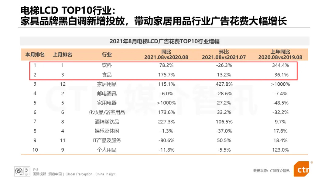 食品饮料在户外广告的花费也实现连月增长。8月份饮料行业的整体户外广告花费同比增长翻倍,该行业在电梯LCD和电梯海报的投放同比涨幅分别为78.2%、132.0%;食品行业在整体户外广告渠道的花费继续处于头部位置,8月花费同比上涨175.1%,该行业在电梯LCD增投尤其明显,涨幅达175.7%,在电梯海报的投放同比增长19.7%。
