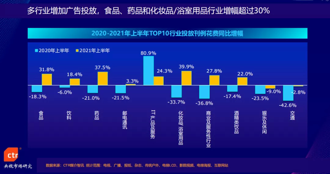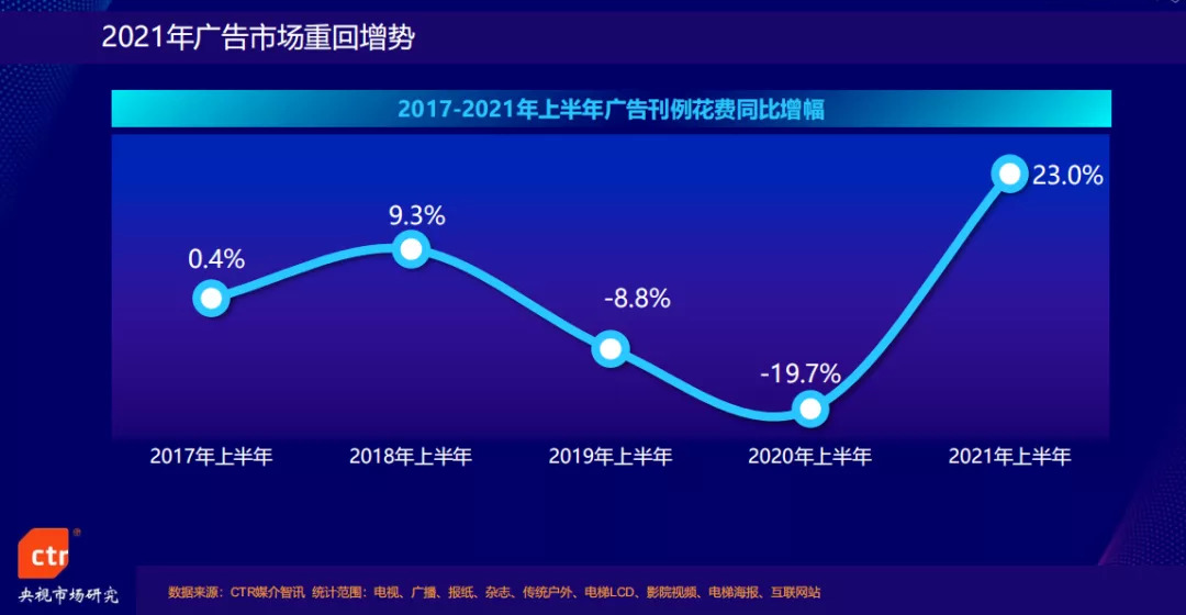 据CTR媒介智讯的数据显示,2021年上半年广告市场的整体增量达到23%,相比于过去两年的连续下滑,这个增量显得尤为瞩目。
