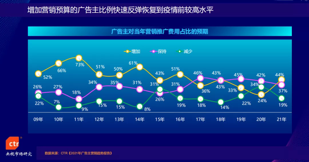 广告市场一系列飘红的数据透露着整体市场恢复性的增长,而这些增长主要源于广告主对市场的预判是充满积极的态度。据CTR连续多年的广告主营销调查显示,今年广告主在对自身、所在行业以及市场的整体状况的信心相较于前两年的低谷期有很明显增加。信心的增强同样体现在广告主的营销费用上,去年年初受到疫情因素的影响,广告主普遍表示将降低预算,但是在今年,有44%的广告主将选择增加营销预算,19%的广告主会减少他们的营销预算。这意味着市场营销的盘子相对于去年有所扩大,这种趋势对于媒体也产生了积极影响。