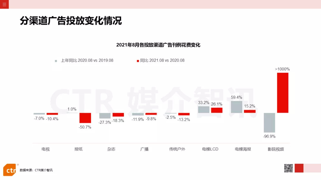 2021年8月各投放渠道广告刊例花费变化,图:CTR媒介智讯
