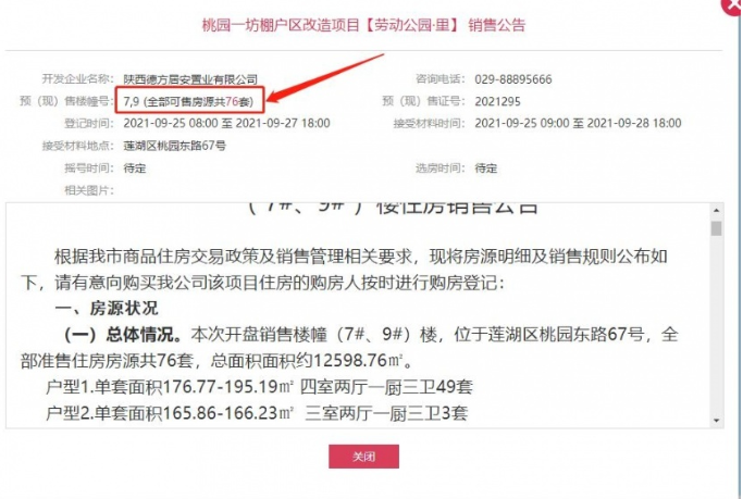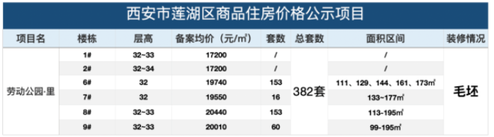 在查找相关资料的时候发现,劳动公园里在今年7月份公示了六幢楼的备案价,分别是1#、2#、6#、7#、8#、9#,共计382套毛坯房源,面积区间为99.44---195.21㎡,价格区间为 17200-29500元/㎡,而7号楼公示的房源只有16套,9号楼公示的房源60套,刚好就是线上登记的共计76套房源。
