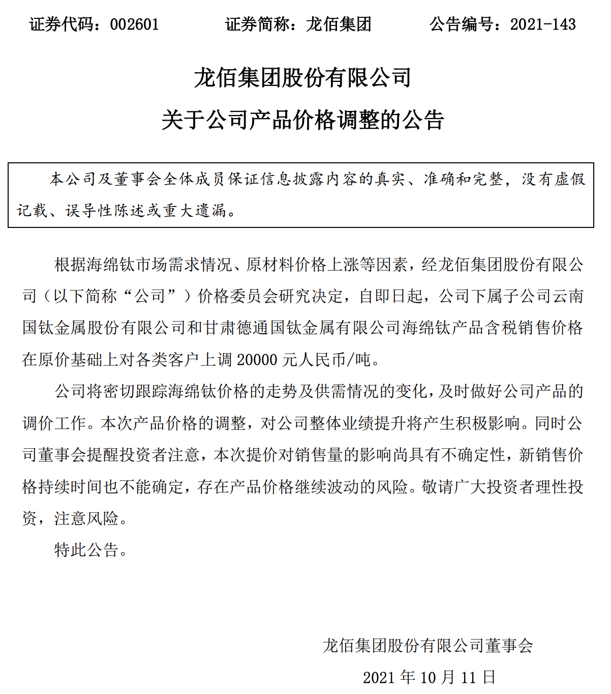 龙佰集团10月11日发布公告称,根据海绵钛市场需求情况、原材料价格上涨等因素,经公司价格委员会研究决定,自即日起,公司下属子公司云南国钛金属股份有限公司和甘肃德通国钛金属有限公司海绵钛产品含税销售价格在原价基础上对各类客户上调20000元人民币/吨。