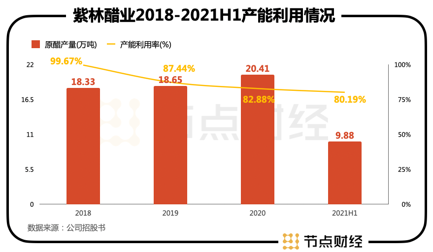 由于紫林醋业拟募集资金用途中专有一笔“年产10万吨酿造食醋生产线建设项目”款,因此企业现有产能容量及利用情况受到密切关注。在2018年至2021年6月末的三年一期中,企业原醋产量分别为18.33万吨、18.65万吨、20.41万吨和9.88万吨,产能利用率各为99.67%、87.44%、82.88%和80.19%。