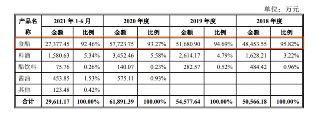 紫林醋业的主营业务为食醋系列产品、醋饮料和料酒的研发、生产和销售。其中食醋产品在公司收入构成中占据首位,各期收入贡献比均过9成。该业务线对内决定企业整体发展,对外被当成反映公司走向势头的晴雨表,是帮助紫林顺利闯关的关键。