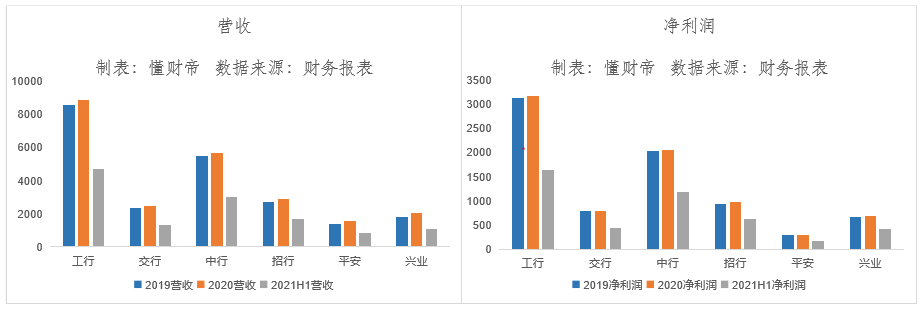 详细拆解2019、2020、2021H1的业绩数据来看,六家银行虽然保持了稳健增长态势。但值得注意的是,受2020年新冠疫情冲击,银行净利润规模与2019年相比,基本原地踏步。