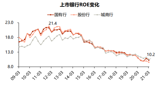 浙商证券发布的研报显示,以国有银行为例,净资产收益率(ROE)从最高点的21.4%持续下滑至2021年3月的10.2%,整体盈利能力下降了一半。