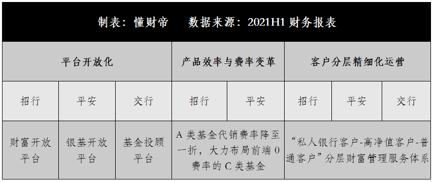 根据公开信息与2021H1财务报表,懂财帝将银行机构的主流打法分为三类:平台开放化、产品效率与费率变革、客户分层精细化运营。