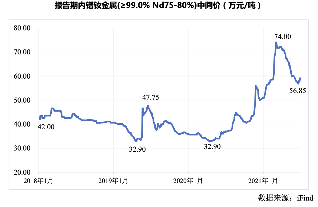 招股书显示,2018年-2020年公司的镨钕金属平均采购价格均在35万元/吨上下浮动,而2021年上半年的平均采购价格迅速拉升至52.46万元/吨,而产品定价通常采用成本加成方式,稀土金属的价格波动对永磁材料行业有较大影响。