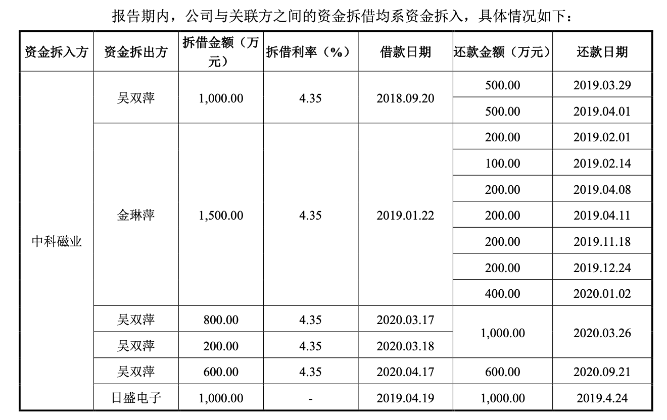 首先,为满足贷款银行受托支付要求,2019年4月19日公司先从关联方东阳市日盛电子有限公司(简称“日盛电子”,吴春萍持股2%、其儿子吴宇杰持股98%)借款1000万元,随后于4月24日委托贷款银行(农业银行东阳影视城支行)将1000万贷款支付给日盛电子用于归还前述借款,2020年4月17日公司已偿清银行贷款。