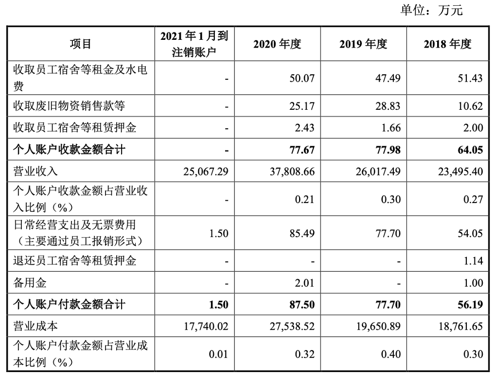 最后,报告期内,通过由公司实际控制的账户收取公司废旧物资及员工宿舍租金等,通过该账户用于公司日常经营支出及无票支出等,具体情况如下: