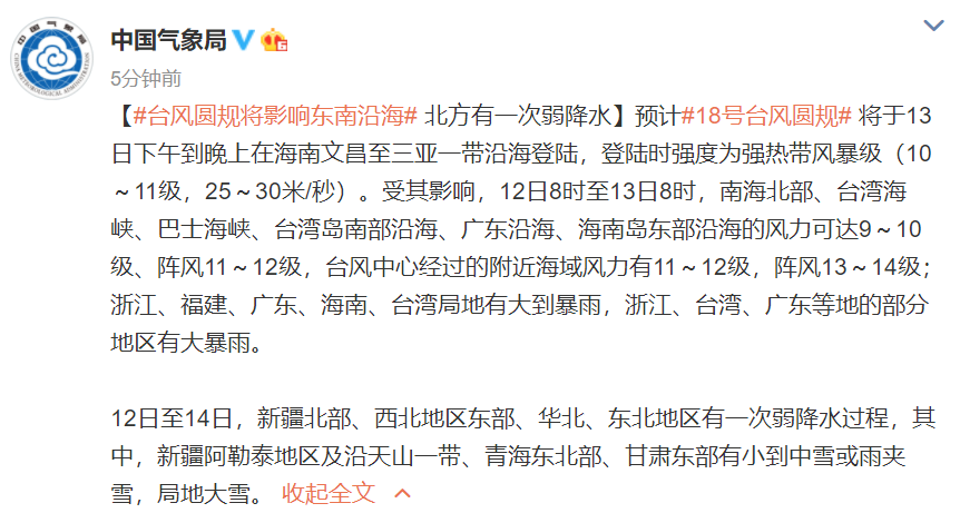 据@中国气象局 微博消息, 预计18号台风“圆规” 将于13日下午到晚上在海南文昌至三亚一带沿海登陆,登陆时强度为强热带风暴级(10~11级,25~30米/秒)。受其影响,12日8时至13日8时,南海北部、台湾海峡、巴士海峡、台湾岛南部沿海、广东沿海、海南岛东部沿海的风力可达9~10级、阵风11~12级,台风中心经过的附近海域风力有11~12级,阵风13~14级;浙江、福建、广东、海南、台湾局地有大到暴雨,浙江、台湾、广东等地的部分地区有大暴雨。