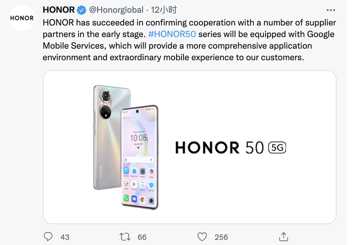 10月11日,荣耀在海外官方社交平台公布,目前荣耀已恢复与谷歌的合作,其中HONOR 50系列海外版本将搭载Google Mobile Services(GMS)。