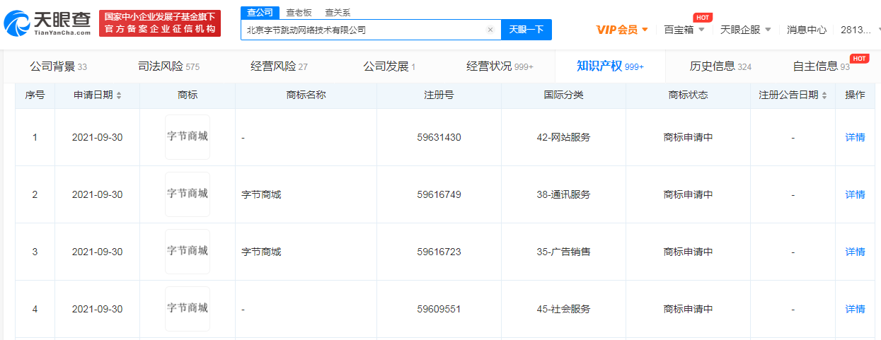 据天眼查APP显示,近日,北京字节跳动网络技术有限公司申请注册多个“字节商城”商标,国际分类涉及广告销售、网站服务等,当前商标状态均为申请中。