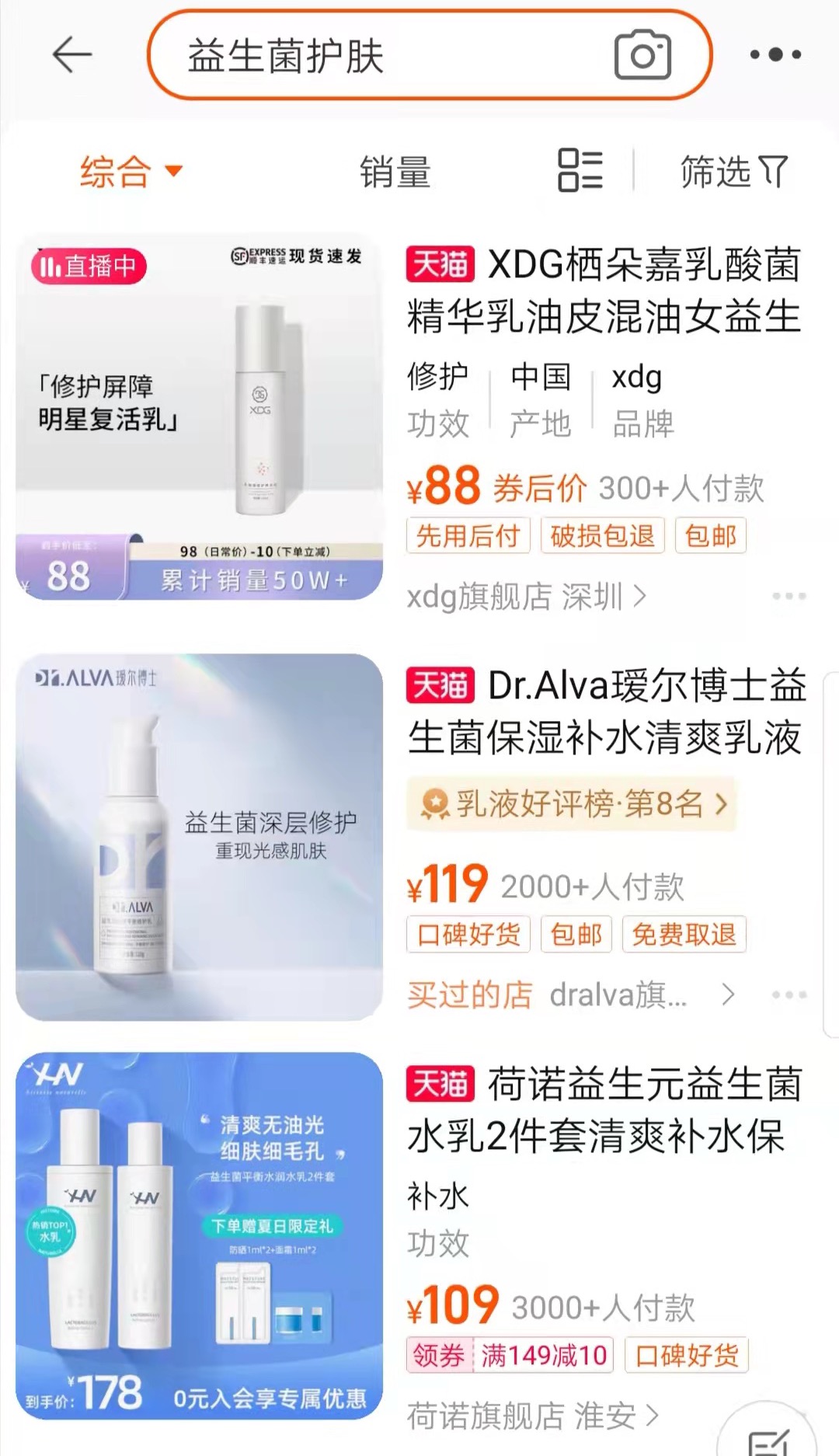 界面新闻记者在各大电商平台上搜索发现,韩国荷诺、韩国布朗社(BLANC DOUX)、韩国爱茉莉ILLIYOON——理润、XDG栖朵嘉以及福瑞达生物旗下的瑷尔博士等品牌都有主打益生菌护肤的产品,产品主要集中在水乳、面霜、面膜等品类上。其中瑷尔博士的益生菌水乳套装销量最高,其在淘宝旗舰店的月销达到3万+,在小红书等社交平台上更是有不少人测评和推荐。
