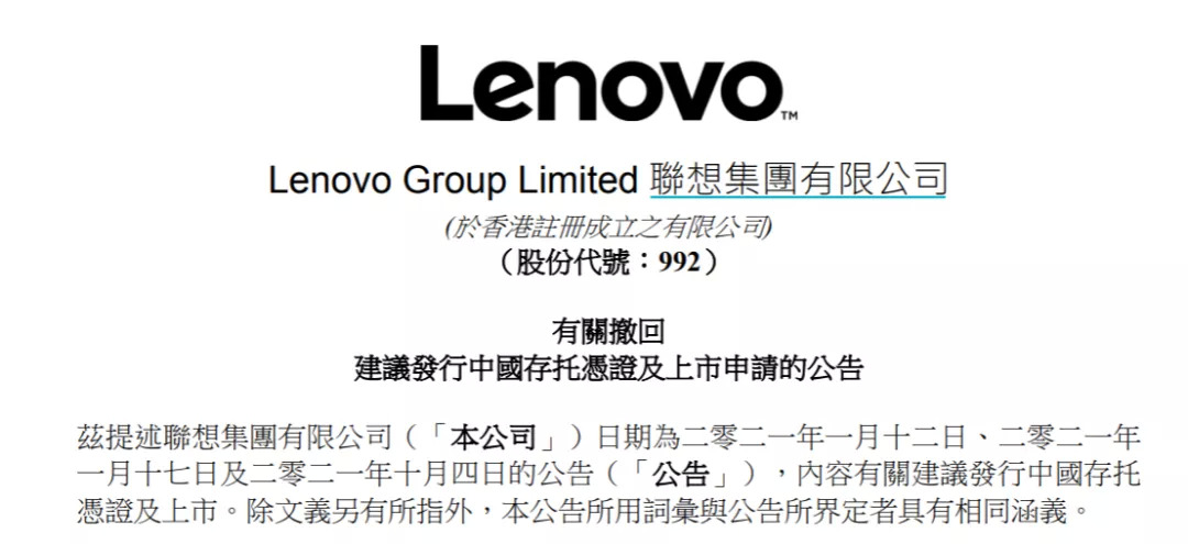 10月10日,港股联想集团发布公告称,“本公司向上交所提交有关建议发行中国存托凭证及上市的申请材料后,考虑到公司业务规模及复杂度,招股说明书中的财务信息可能会在申请的审阅过程中过期失效。同时,审慎考虑最新发行上市等资本市场相关情况后,本公司决定撤回中国存托凭证于科创板上市及买卖的申请”。