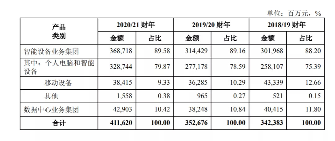 从收入构成来看,个人电脑和智能设备(包含AR/VR设备、智能门锁、投影仪等一系列智能设备)一直为联想集团贡献了重要收入,近三年(2018/19财年至2020/21财年)在其营业收入中占比分别为75.39%、78.59%、79.87%。