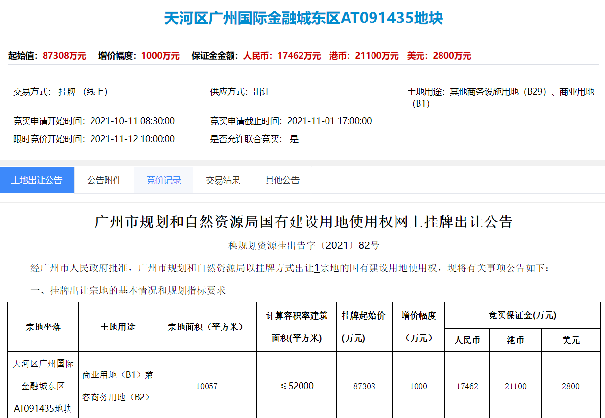 公告显示,地块位于天河区广州国际金融城东区,土地用途为商业用地(B1)兼容商务用地(B2),总面积10057㎡,挂牌总价8.73亿元,折合楼面价16790元/㎡。地块将于2021年11月12日10时起限时竞价。