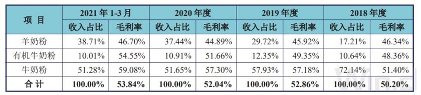 美庐生物的产品主要是婴幼儿配方奶粉和调制乳粉,另外还有少量的特医食品。其中,婴配粉则包含羊奶粉、牛奶粉、有机牛奶粉3类产品。2018年至2020年,美庐生物自产婴幼儿配方乳粉的收入从2.48亿元增加到2.71亿元。羊奶粉2020年的收入仅为1.01亿元。尽管近年来增速较快,但也仅占总营收的三成左右。