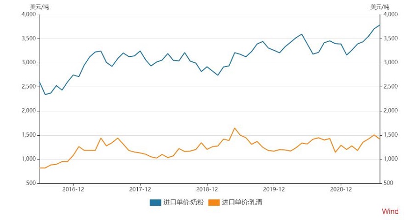 美庐生物的牛奶粉业务在竞争环境变差,业绩压力大增情况下,毛利率竟然从2018年的51.4%逐年增加到今年一季度的59.08%。售价方面,2019年乳铁蛋白价格上涨,美庐生物对部分产品提价,牛奶粉销售均价上涨11%。随后2020年,美庐生物牛奶粉的销售均价又从8.94万/吨下降到8.63万/吨,降幅为3.51%。成本方面,美庐生物的原奶料主要是全脂乳粉和乳清粉。Wind数据显示,进口乳粉和进口乳清粉近三年的均价呈稳中有升趋势。尤其是2018年和2020年全年成本呈增长趋势。这样看来,美庐生物2019年毛利率升高尚有合理解释,但2020年美庐生物在单价下滑,成本端承压情况下是如何实现毛利率继续提升的呢?