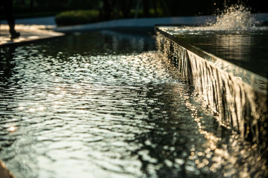 一架直径30多米的弧形廊架横空舒展,大气宽阔,廊架旁2棵静心挑选的造型树优雅矗立。弧形的廊架下,水流潺潺,自“山顶”顺势跌落。凉风习习,吹走了在外奔波一天的劳累,让外出打拼疲惫了一天的身心,从此开始放轻松。