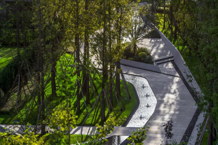 另一条主轴则自入口处横贯庭院,以榉树为主题,直立、挺拔。秋天的榉树林,就好像变幻莫测的万花筒,几乎是一天一个样,让漫步其中的人们每天都会有不一样的新体验。
