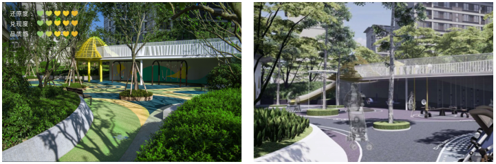 这条名为蓝楹绿谷的轴线,高大的蓝花楹顺势舒展,构建起一条林下小道。如今的蓝花楹还仅仅只有绿叶伸展,但是可以想见,每年2次花期时节,靛紫的云雾飘散,和家人携手漫步林下,予生活无尽的温馨浪漫。