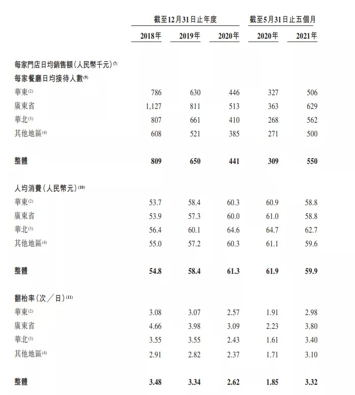 今年前5月,绿茶同店收入较2020年提升89.6%至7.69亿元,业绩有所回暖,但翻台率依然不高。对于餐饮品牌来说,重要的指标有两个:客单价和翻台率。客单价即人均消费,翻台率指的则是餐桌重复使用数。客单价和翻台率较高,餐厅的坪效就越高,经营效益就越好。绿茶主打性价比,客单价很难大幅度提升,翻台率又滑落。2018-2020年,绿茶的翻台率分别为3.5次/日、3.3次/日、2.6次/日,而2020年海底捞翻台率为3.5次/日,差距明显。