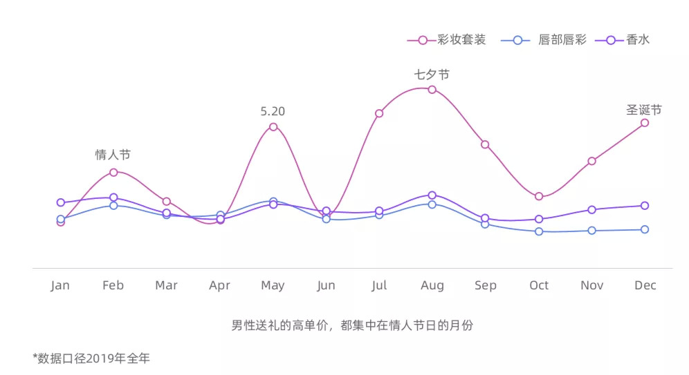 这使得对美妆产品一窍不通的直男们,想给女朋友买化妆品,通常缺乏决策参考与选购推荐,此时精准营销这个人群及节日场景,是非常聪明的选择。