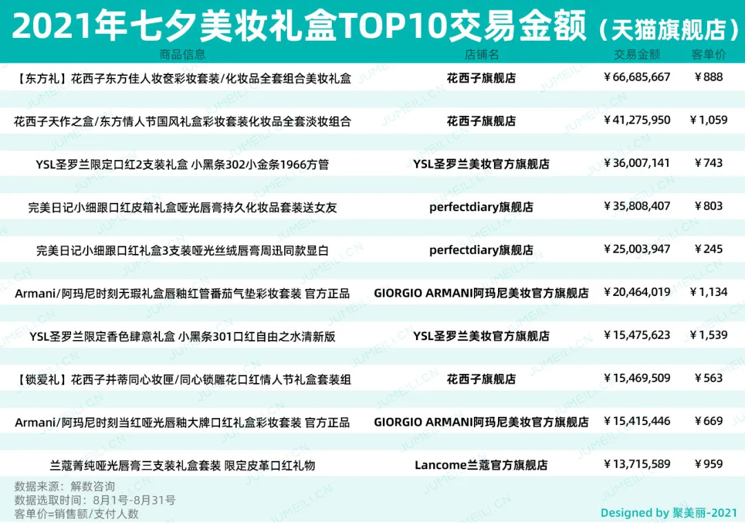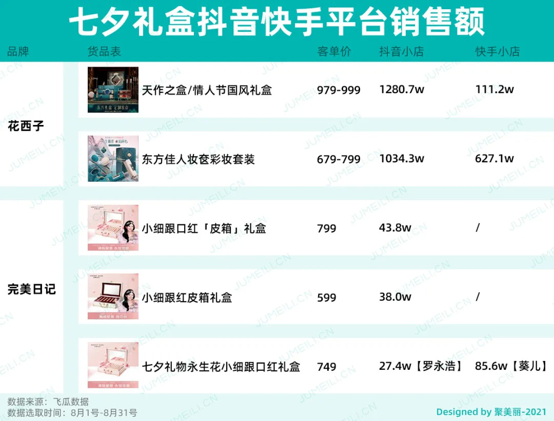 而在8月份抖音与快手平台的七夕礼盒销售额中,花西子则为完美日记的15.6倍。