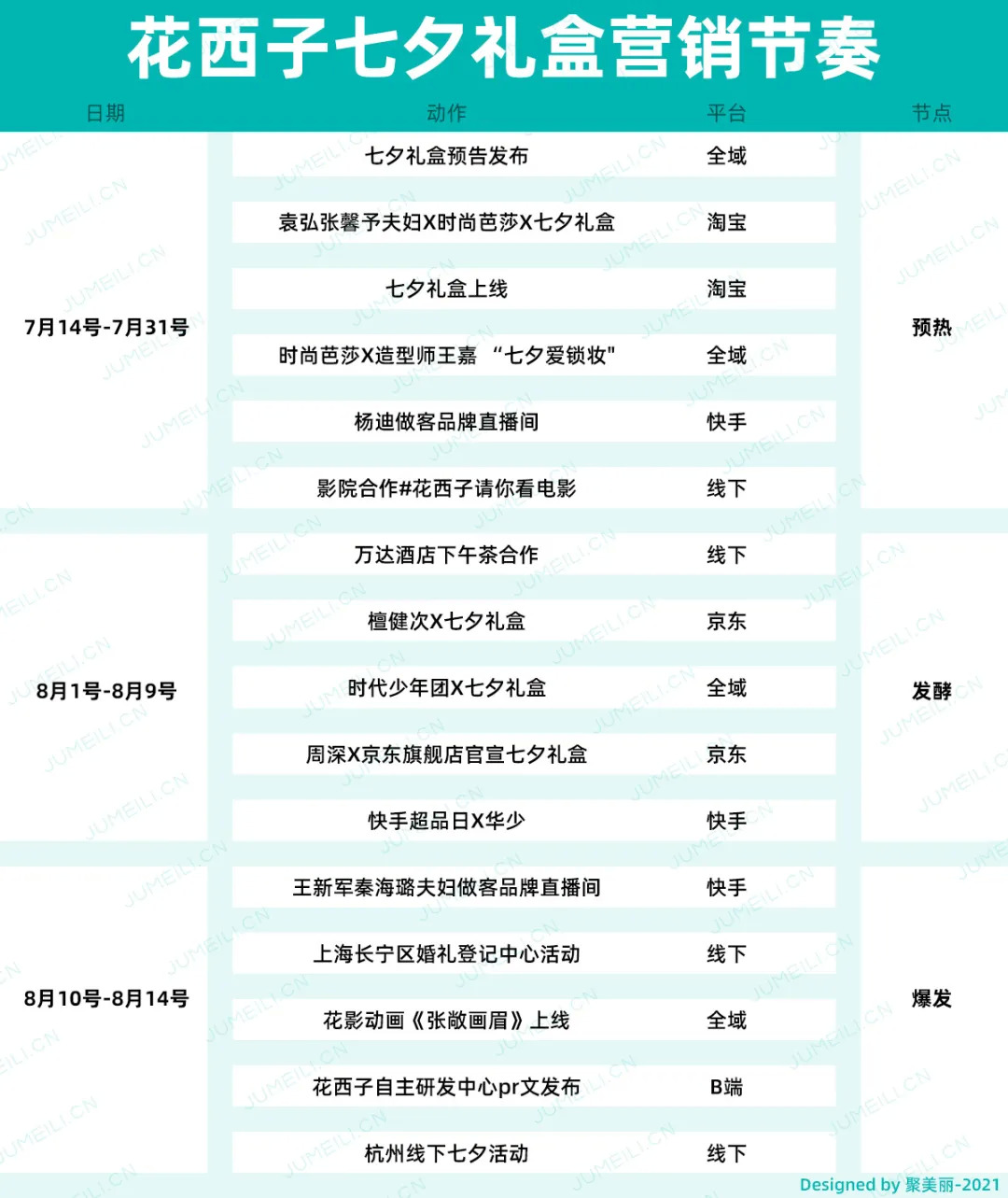 我们从8月14号七夕节当天往前倒推至7月14号,可以发现这1个月花西子规划了紧凑的营销节奏。