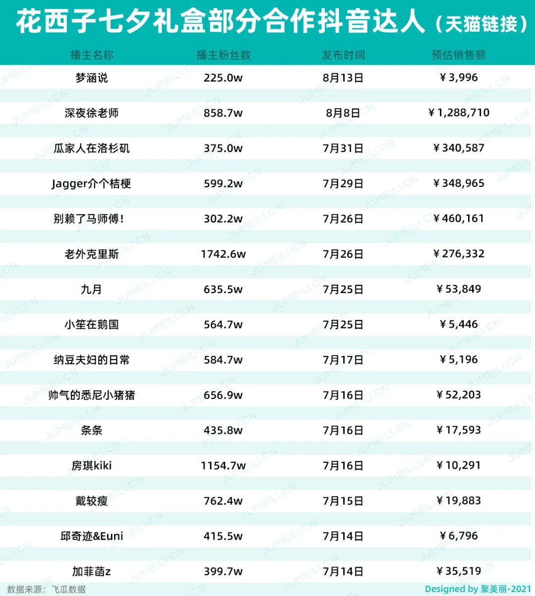 从7月14号至8月14号,共计76条短视频携带了花西子天猫旗舰店的七夕礼盒链接,剔除掉本身拥有348.1w粉丝数的花西子官号(花西子Florasis),三百万粉丝以上的红人共计15位。