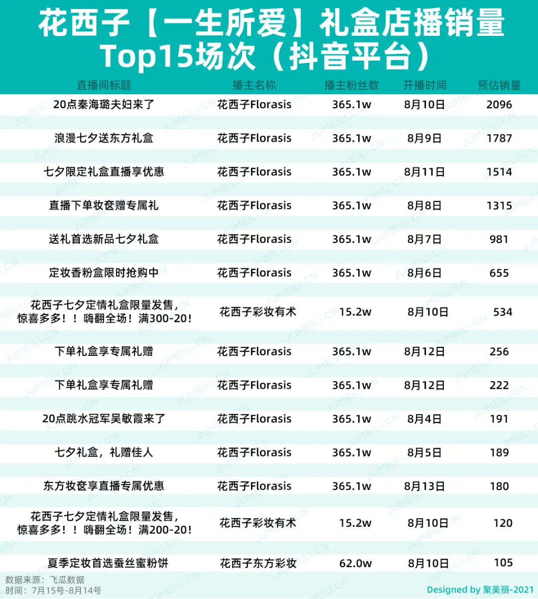 与此同时,花西子通过“差异化人设+定向引流”的直播间矩阵,以及七夕期间每天长达15小时的直播、明星做客直播间等,使得花西子的七夕礼盒在抖音平台上的销量基本上是靠“自给自足”的形式,在一个月中以七夕礼盒该单品完成了约2千3百万的销售额。