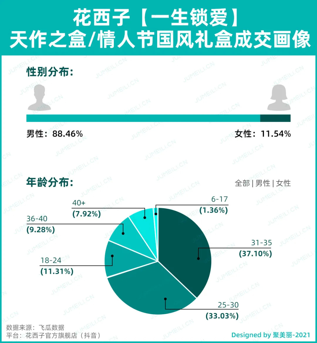 “世上直男千千万,买花西子的占一半。”在飞瓜数据上显示,抖音平台下单价值999元的花西子七夕礼盒的用户人群中,88.46%的都集中在男性群体,且37.1%为31-35岁的中青年男性。