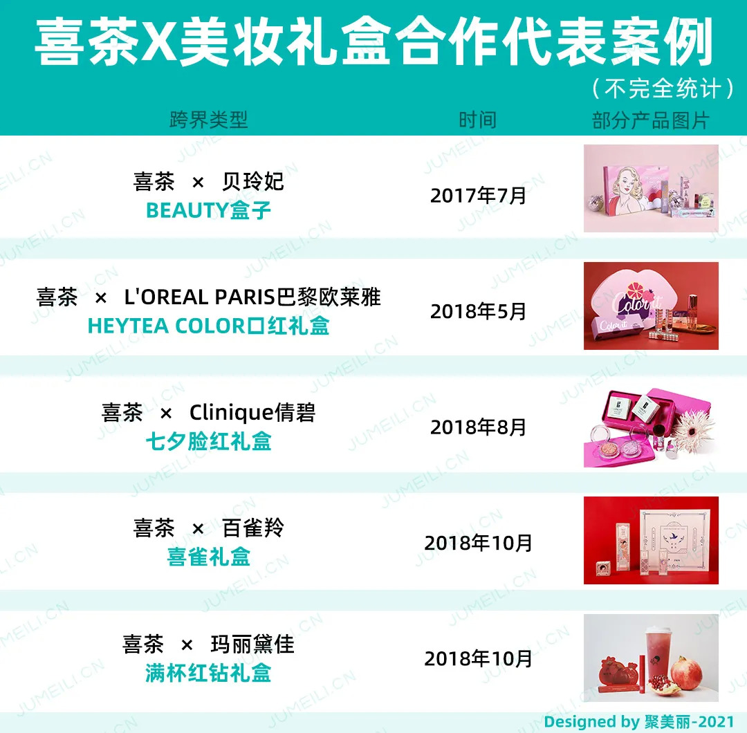 早在2017年,喜茶就已经推出与贝玲妃品牌美妆礼盒的跨界营销。2018年,喜茶联合L'OREAL PARIS巴黎欧莱雅则推出HEYTEA COLOR(喜茶色)口红礼盒。